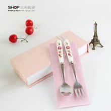 创意礼品调羹不锈钢小勺子叉子新婚装两件套装陶瓷柄餐具赠品礼盒