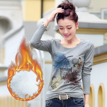 2016冬装女式上衣加绒加厚打底衫修身秋冬印花长袖T恤女衣服体恤