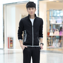春秋运动休闲纯色男士套装 青年开衫卫衣男无帽纯棉运动外套一套