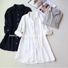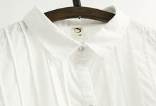 外贸单简约百搭文艺压线褶皱小方翻领中长款棉衬衫白女