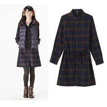 日单外贸无印风格MJ*中长款法兰绒格子良品腰带衬衫裙外套风衣女