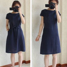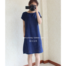 日单外贸无印风格亚麻宽松简约显瘦小A字侧口袋圆领良品连衣裙