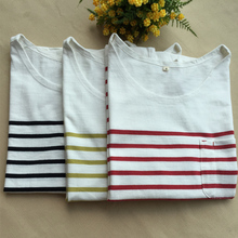 日单外贸原单无印MUJ*有机棉全棉条纹带口袋经典休闲良品风T恤女