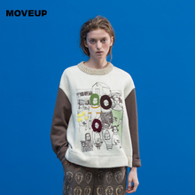 MOVEUP幻走春秋印花撞色拼接宽松中长款加厚卫衣式保暖长袖t恤女
