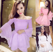 名媛气质女装春秋新品可爱性感一字领仙女范甜美公主蓬蓬连衣裙