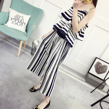 2017夏装新款女装韩版吊带竖条纹上衣+阔腿长裤子两件套套装潮女