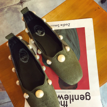 2017新款女鞋平底鞋甜美平跟方头卡其色单鞋性感绒面珍珠鞋子包邮