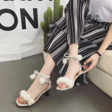 脚腕绑带性感凉鞋粗跟露趾一字扣带水貂毛凉鞋时尚潮罗马凉鞋爆款