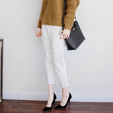 春夏磨破白色破洞牛仔裤女长裤小脚裤 弹力紧身铅笔裤修身显瘦