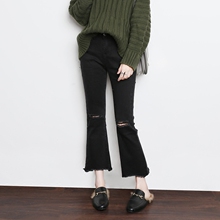 韩版中腰黑色九分喇叭牛仔裤女弹力修身显瘦毛边微喇9分裤女春款