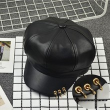 韩版百搭皮质南瓜铁环八角帽子女韩国春夏天黑色鸭舌蓓蕾贝雷帽潮