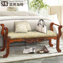 思图加特美式家具实木床尾凳带扶手换鞋凳欧式复古雕花床边凳
