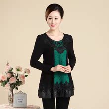 秋冬中年妈妈装大码加绒T恤中老年女装蕾丝中长款加厚保暖打底衫