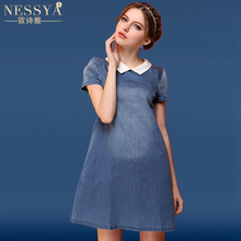 霓诗雅夏装新款大码女装娃娃领显瘦A字牛仔连衣裙短袖2017牛仔裙