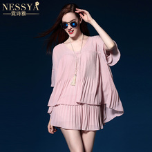 霓诗雅2016夏季新品圆弧短袖褶皱轮廓A型宽松时尚优雅多色连衣裙