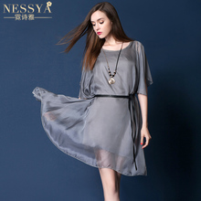 霓诗雅2017夏季新款欧美高端真丝中长款宽松桑蚕丝A字连衣裙女