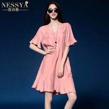 霓诗雅2017春装铜氨丝大码连衣裙女装宽松气质大摆春夏裙中袖时尚