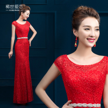 敬酒礼服新娘结婚旗袍红色长款鱼尾蕾丝晚礼服2016新款女