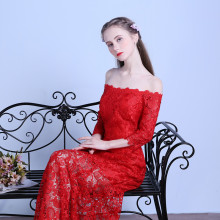 一字肩红色镂空中长款晚礼服2016新款新娘敬酒服夏婚礼敬酒礼服