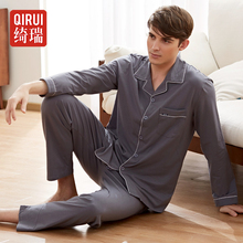 绮瑞春秋季男士睡衣长袖纯棉开衫大码宽松纯色简约全棉家居服套装