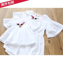 母女装2017夏季新款女童白色娃娃衫纯棉喇叭袖上衣裙亲子装配项链