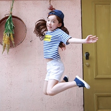 夏季韩版童装女童牛仔短裤套装中大童条纹t恤白色五分裤子两件套