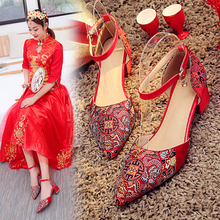 中式结婚鞋子2017新款春季女士高跟红色秀禾服红鞋粗跟绣花新娘鞋