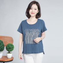 40-50岁中年妈妈装夏装棉麻短袖t恤女宽松大码中老年女装印花上衣