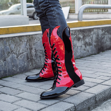 17个性男靴子 韩版潮流高筒牛仔靴 漆光皮拼色摇滚男士舞台长筒靴
