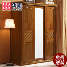 华南家具 现在中式卧室推拉门实木衣柜原木3门带镜移门衣橱储物柜