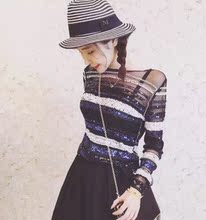韩国代购 2017春季欧美新款透明网纱条纹钉珠蕾丝刺绣亮片衫