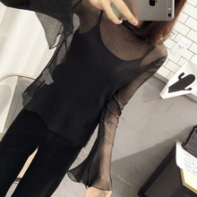 2017夏季新款韩版性感透视宽松勾花镂空喇叭袖蕾丝衫女上衣两件套