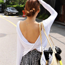 2017春装新款女装 时尚潮女交叉大露背心机长袖白色休闲T恤