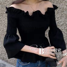 2017春装新款女装 韩国代购木耳边一字领包身喇叭袖荷叶摆上衣