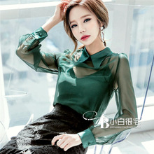 2017春装新款衬衫 韩版翻领灯笼袖吊带墨绿色透视2件套上衣女长袖