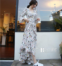 2017新款女装春款 韩版交叉V领喇叭袖高腰超长碎花连衣裙夏中长款