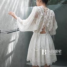 2017春装新款女装 韩国代购蕾丝露背绑带蝙蝠袖绣花女神连衣裙