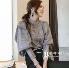 2017春新款女装 韩版女装背后大蝴蝶结大灯笼袖格子衬衫上衣