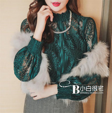 2017春装新款女装 韩国代购小高领缩口灯笼袖透视2件套蕾丝上衣