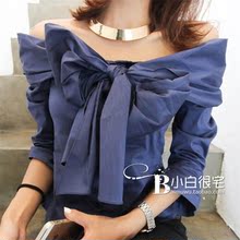 2017春装新款女装 韩版女装露肩一字大蝴蝶结领宝蓝色衬衫上衣
