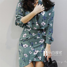 2017春装新款女装 韩版订制V领交叉绑带裙摆绿色花蝙蝠袖连衣裙
