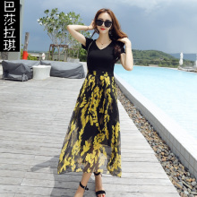 雪纺连衣裙 2017夏新款时尚拼接碎花中长款淑女收腰修身裙短袖