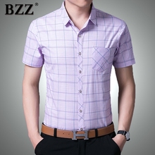 Bzz夏季新款中老年短袖格子衬衫男 中年宽松真口袋爸爸装棉衬衣男