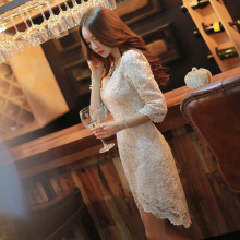 连衣裙秋冬2016新款镂空蕾丝包臀裙名媛修身长袖礼服中长款秋冬款