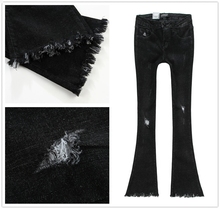 2017春韩国代购毛边流苏弹力复古破洞中腰微小喇叭牛仔裤九分女
