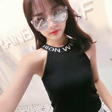 2017新款夏季挂脖修身显瘦字母圆领黑白拼色挖肩无袖针织小背心女