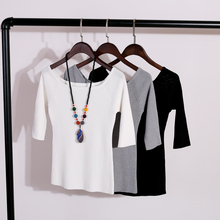 针织衫女套头薄春夏弹力冰丝打底中袖T恤修身一字领五分袖打底衫