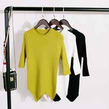 2017春季女装纯色修身下摆不规则五分袖打底针织衫女套头中袖上衣