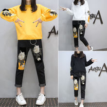 大码套装女胖mm2017新款 春秋宽松刺绣t恤上衣牛仔九分裤两件套潮