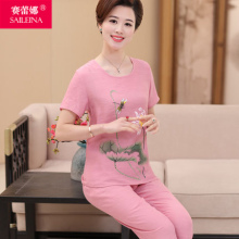 中老年女装夏装套装短袖夏季妈妈装宽松大码棉麻T恤+阔腿裤两件套